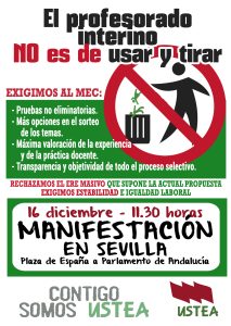 Es necesario que todas y todos vayamos a Sevilla el próximo sábado para defender la estabilidad del profesorado interino. Aquí podéis ver la información de los autobuses que saldrán desde las distintas provincias. Para cualquier consulta poneros en contacto con la sede de vuestra provincia.