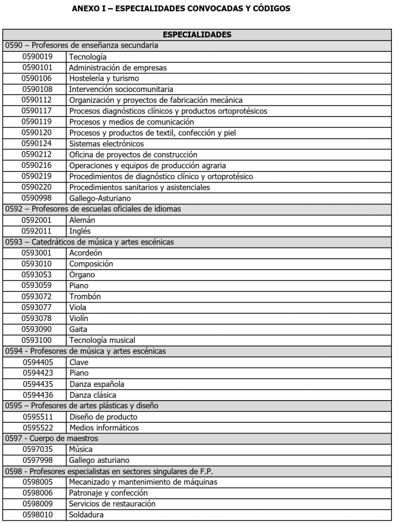 La convocatoria afecta a varios cuerpos docentes que imparten las enseñanzas escolares del sistema educativo. La lista completa de especialidades y materias convocadas se encuentra en el Anexo I de la Resolución.