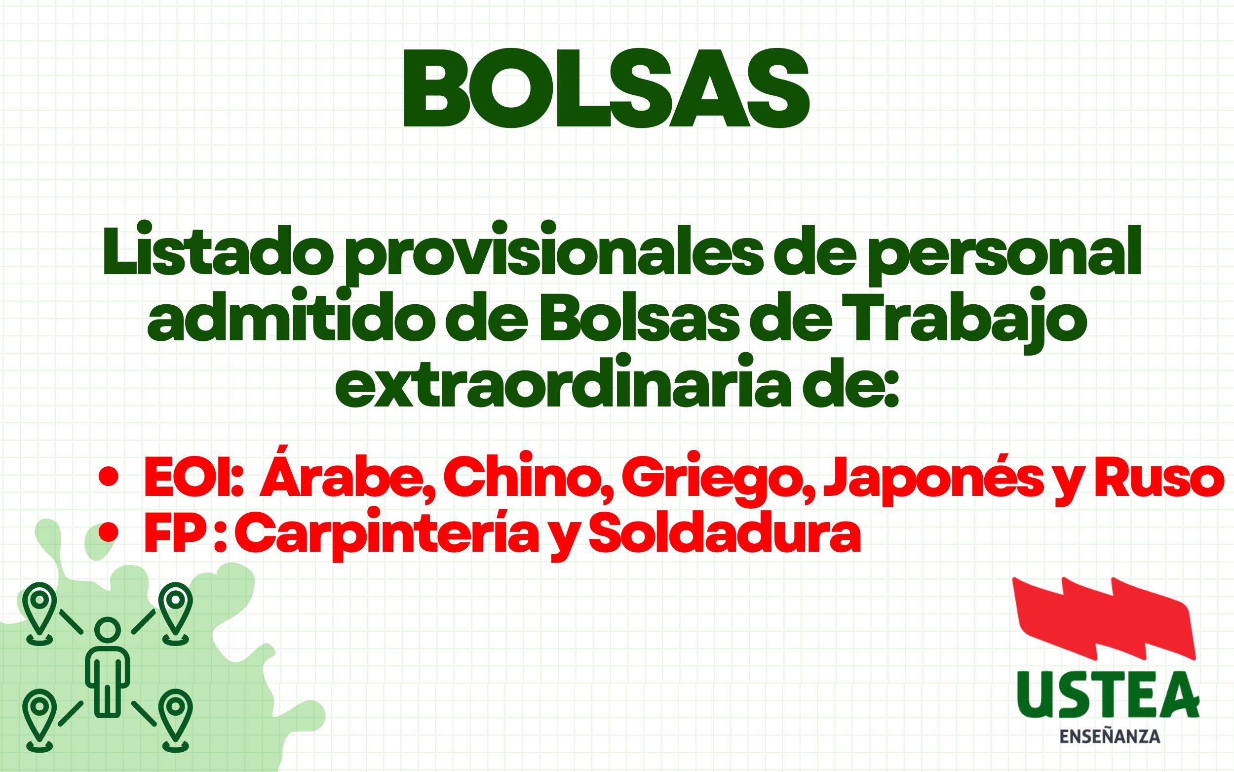 Resolución de 10 de noviembre de 2025, de la Dirección General del Profesorado y Gestión de Recursos Humanos, por la que se publican los listados provisionales del personal admitido y excluido de la convocatoria extraordinaria de acceso a bolsas de trabajo docentes realizada por Resolución de 25 de septiembre de 2025, correspondientes a las especialidades de Árabe, Chino, Griego, Italiano, Japonés y Ruso, del Cuerpo de Profesores de Escuelas Oficiales de Idiomas y Fabricación e instalación de carpintería y mueble y Soldadura, del Cuerpo de Profesores Especialistas en Sectores Singulares de la Formación Profesional