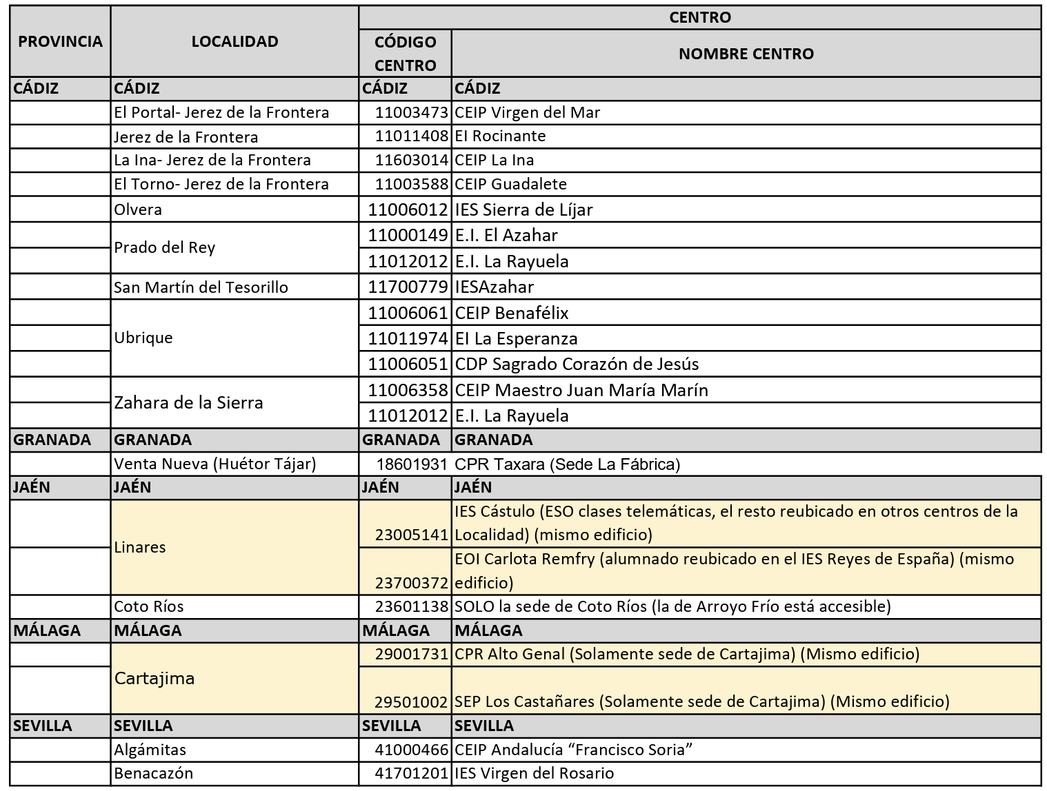 - Cádiz: 2 localidades (6 centros) y 13 centros de distintos municipios