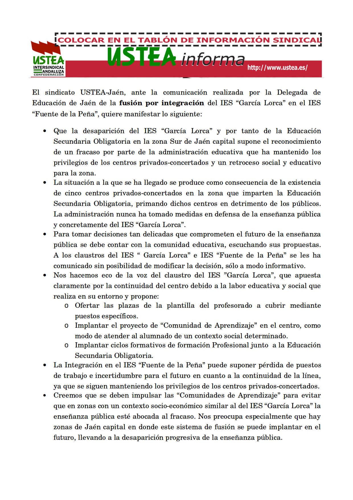 El sindicato USTEA, ante la comunicación realizada por la Delegada de Educación de Jaén de la fusión por integración del IES “García Lorca” en el IES “Fuente de la Peña”, quiere manifestar lo siguiente: