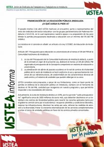 USTEA considera esta propuesta, a pesar de sus limitaciones, como un buen punto de partida en defensa de la educación pública en Andalucía, siempre con el horizonte de destinar el 7% del PIB, cantidad que recogemos en nuestro programa y que permitiría responder a las necesidades del sistema.