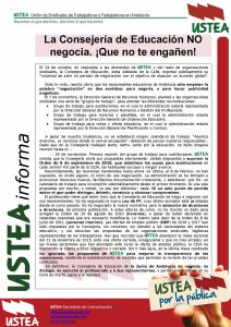 El profesorado tiene que tener claro que la Consejería de Educación se niega a negociar con sus representantes. No ha negociado la nueva Ley de FP, cuyo último borrador está paralizado desde el curso pasado. No ha negociado la nueva normativa para la selección de directores y directoras, de próxima publicación. A estas alturas de curso, no ha movido un dedo para arreglar la Orden de 20 de agosto de 2010 (horarios), a pesar de haber declarado en repetidas ocasiones que era necesario modificarla. Lo mismo cabe decir de la Orden de 8 de junio de 2011 (personal interino). Las ofertas de empleo público (OEP) de 2016 y 2017 han sido impuestas por la Consejería, sin consenso, sin atender a las necesidades del sistema educativo, y sin escuchar las propuestas de las organizaciones sindicales, legítimas representantes de las trabajadoras. Hay que recordar que USTEA abandonó la mesa sectorial del 22 de diciembre de 2015, ante una oferta cerrada, innegociable y que no crea empleo; en las mesas sectoriales que han abordado este curso la oferta de empleo público, la CEJA ha mantenido la misma actitud impositiva y cerrada. Sin ir más lejos, en la última mesa celebrada ha ignorado las propuestas de USTEA para mejorar la transparencia de las oposiciones, mediante el establecimiento de medidas que permitan la revisión de las pruebas calificadas.
