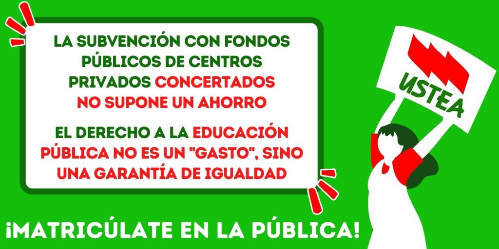 Desde USTEA entendemos que el acceso a una educación pública de calidad es un derecho fundamental de toda la población y que, por lo tanto, los poderes públicos tienen la obligación de garantizarlo por encima de cualquier criterio economicista o de “gasto”. Sin duda, solo una educación cien por cien pública es capaz de garantizar el derecho a la educación en condiciones de igualdad para todos y todas, en contraposición al modelo de privatización a través de los conciertos educativos que, como vemos, profundiza en la segregación socioeconómica del alumnado, provocando mayores desigualdades educativas e incidiendo negativamente en la cohesión social.