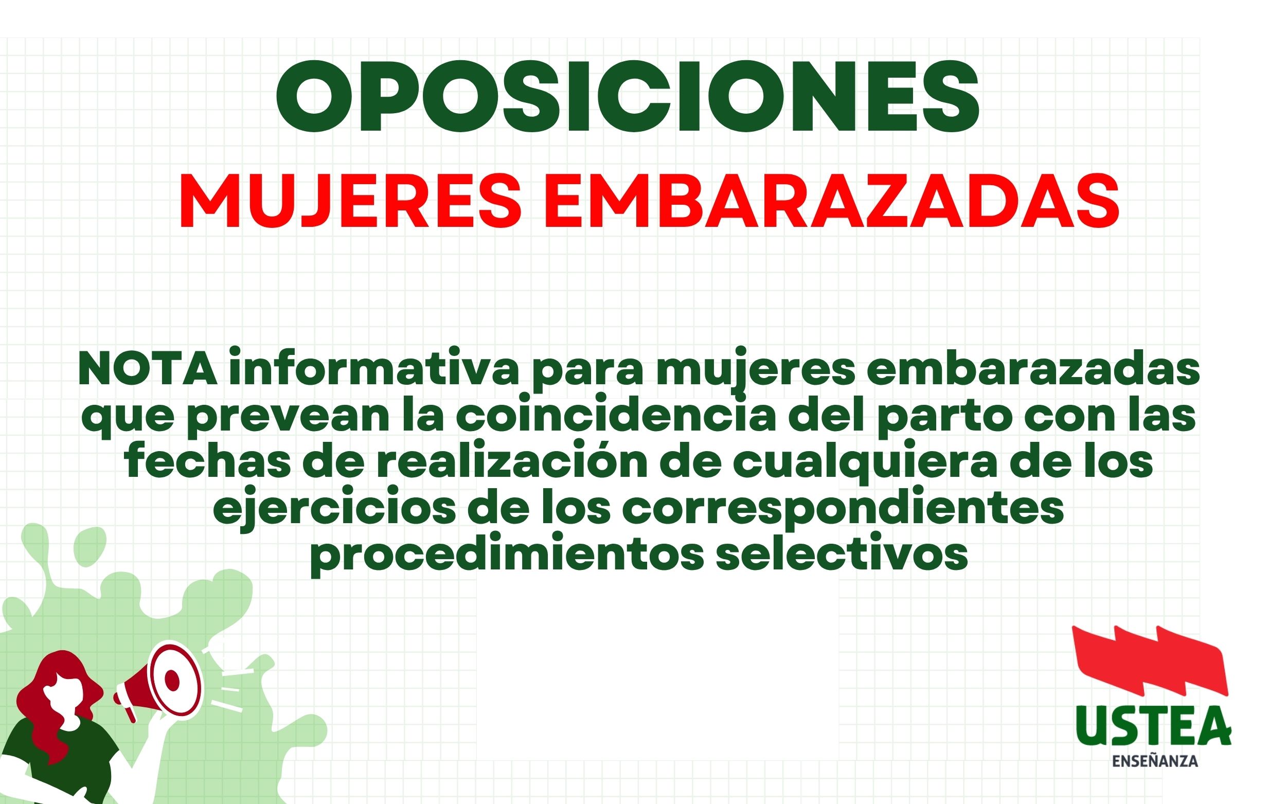 Se recuerda que de acuerdo en lo indicado en el apartado quinto de la base séptima de la Orden de 20 de febrero de 2026, las mujeres embarazadas que prevean la coincidencia del parto con las fechas de realización de cualquiera de los ejercicios de los correspondientes procedimientos selectivos, desde la publicación de la lista definitiva de personal admitido y excluido hasta la finalización de la fase de concurso-oposición, incluido el acto de presentación, por las circunstancias derivadas de su avanzado estado de gestación o, eventualmente, en los primeros días del puerperio, podrán ponerlo en conocimiento de la Dirección General del Profesorado y Gestión de Recursos Humanos. Esta comunicación se deberá realizar a través del portal de la persona opositora en el botón Embarazadas.