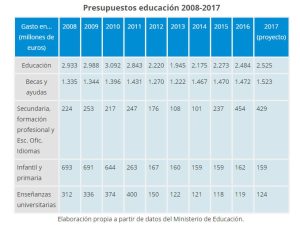 El proyecto de Presupuestos Generales del Estado para 2017 destina un 0,7% a Educación, lo que supone un total de 2.525 millones de euros. El porcentaje no ha variado en comparación con los presupuestos de 2016, si bien la cifra ha aumentado en 41 millones de euros.