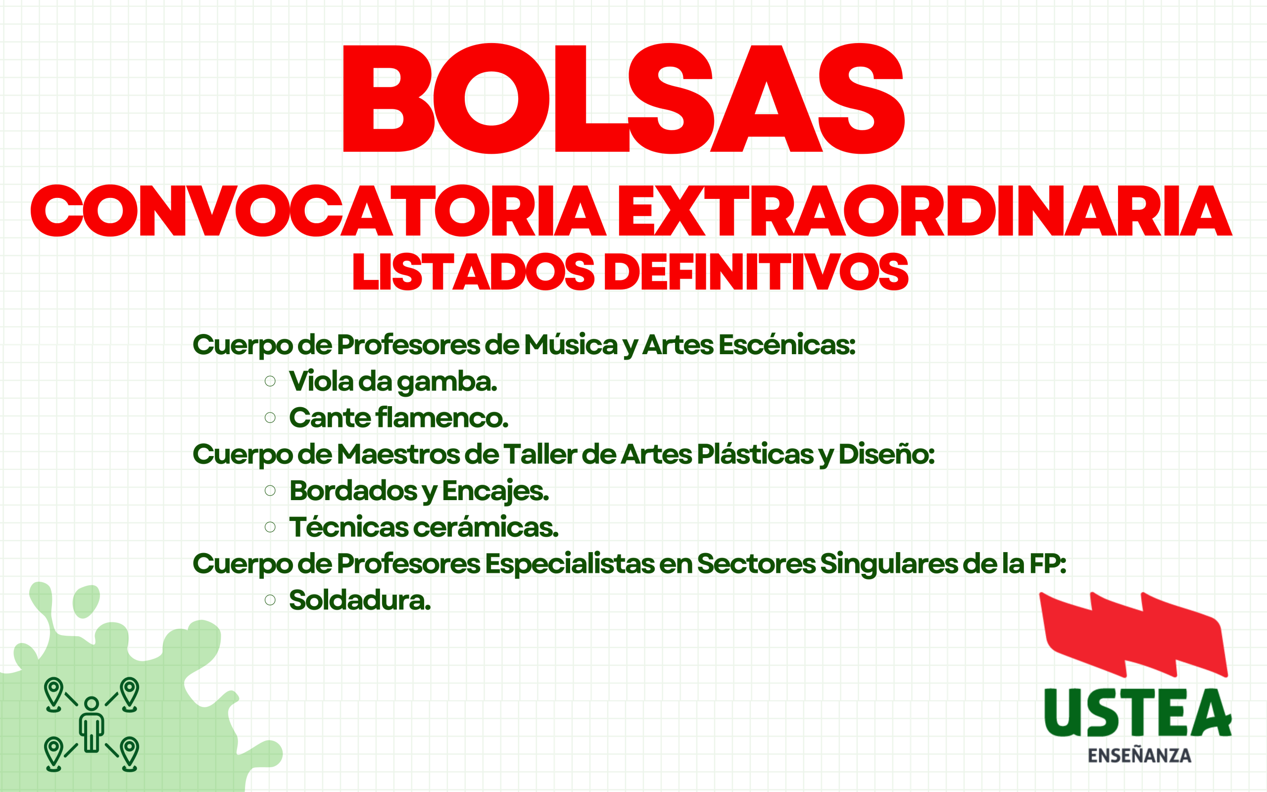 Desde USTEA Enseñanza os informamos de la publicación de la Resolución de 15 de abril de 2026, de la Dirección General del Profesorado y Gestión de Recursos Humanos. Mediante esta resolución, se elevan a definitivos los listados de personal admitido y excluido de la convocatoria extraordinaria de acceso a bolsas de trabajo docente que se realizó el pasado 19 de enero de 2026.