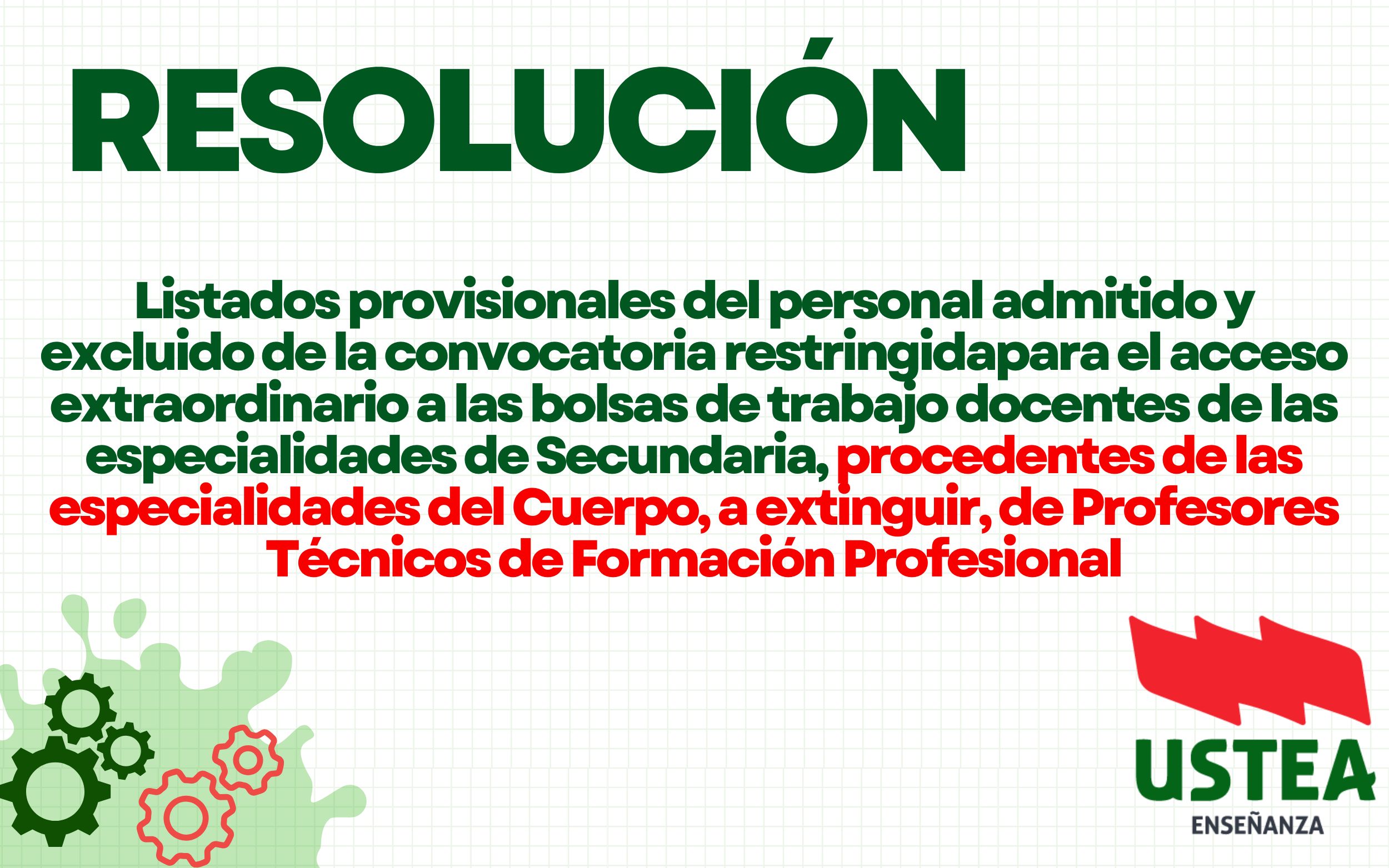 Resolución de 19 de diciembre de 2025, de la Dirección General del Profesorado y Gestión de Recursos Humanos, por la que se hacen públicos los listados provisionales del personal admitido y excluido de la convocatoria restringida realizada por Resolución de 29 de octubre de 2025, para el acceso extraordinario a las bolsas de trabajo docentes de las especialidades del Cuerpo de Profesores de Enseñanza Secundaria, procedentes de las especialidades del Cuerpo, a extinguir, de Profesores Técnicos de Formación Profesional
