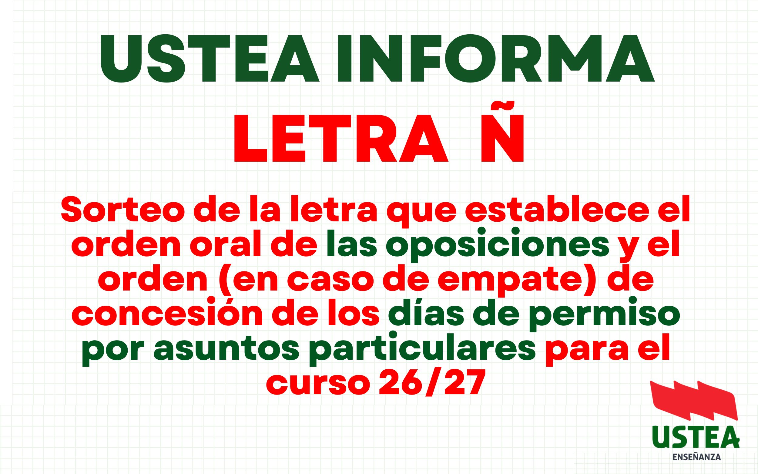 Sorteo de la letra que establece el orden oral de las oposiciones y el orden (en caso de empate) de conseción de los días de permiso por asuntos particulares para el curso 26/27 es la Ñ.