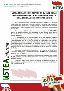 Ayer nuestro responsable federal de organización de USTEA ha declarado como testigo en el Juzgado de Instrucción número 17 de Sevilla y ha ratificado los argumentos de la denuncia que USTEA presentó en la Fiscalía el pasado 29 de marzo de 2017. (https://educacion.ustea.org/los-enchufes-en-educacion-ustea-los-lleva-a-la-fiscalia)