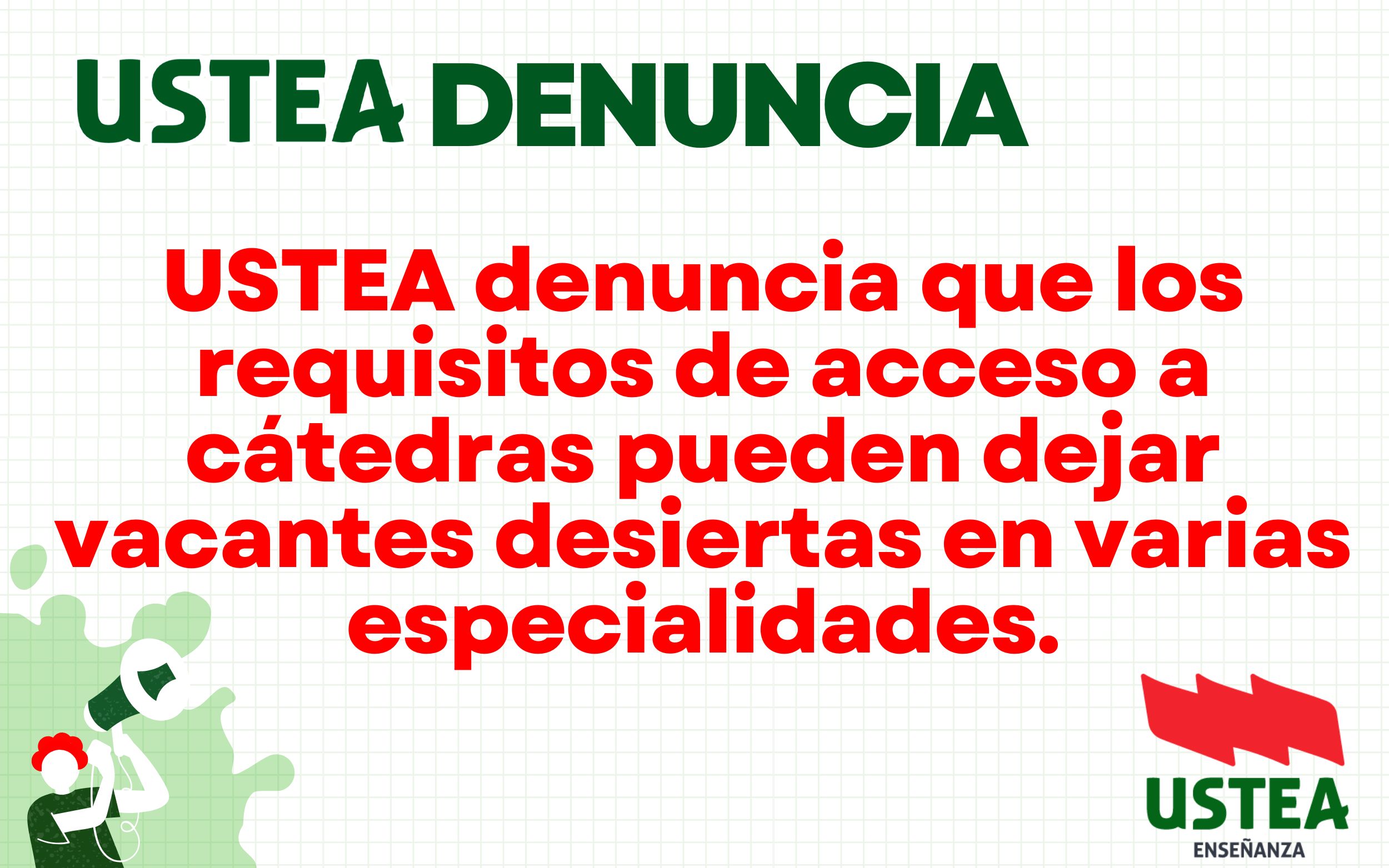 USTEA ha pedido en Mesa Sectorial una revisión urgente de los requisitos para garantizar la viabilidad de la convocatoria en las especialidades de Música y Artes Escénicas, afeando que haya sido incapaz de planificar adecuadamente sus plantillas permitiendo que el personal formado en Andalucía y que accedió como personal funcionario de carrera en las especialidades afectadas, haya tenido la oportunidad de promocionar en esta convocatoria de acceso a cátedras.